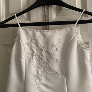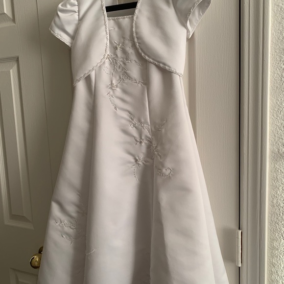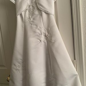 Used once, in excellent condition from a smoke free home. Cinderella Brand white satin dress with matching jacket. All beading is intact and there’s no rips, holes or stains.