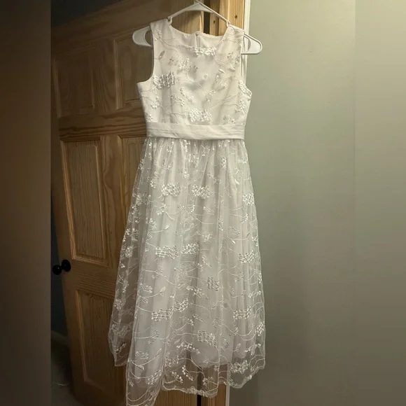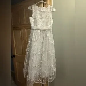 Delicate white sleeveless dress with elegant floral embroidery. Lightweight lined bodice and flowing embroidered skirt for a graceful look. Soft waistband offers a polished silhouette ideal for special occasions. Comfortable and refined styling in crisp white. Would be perfect for a First Communion or wedding. Size 12-13Y