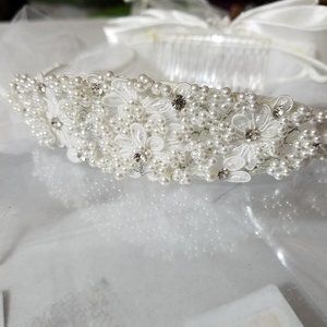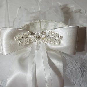 First Communion Flower Girl Veil attached to comb, wreath flower, bow, pearls longest layer 22" long NIP ---Located A15