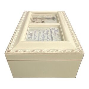What a delightful First Communion gift this lovely music box frame makes! The elegant piece is from the Cottage Garden collection and features a gorgeous distressed creamy finish. The photo frame lid is trimmed with a detailed rope trim and will hold that special First Communion picture. It opens to a lovely black velvet lined interior...the ideal place for keeping treasures. The music box rests on brass feet with foam pads to keep your furniture safe from scratches. Upon opening the lid, you will hear a lovely rendition of "Jesus Loves Me" played by top quality Sankyo musical movement. The music stops when the lid is closed, and the key for winding the music box can be found on the bottom. The box will be engraved with "First Holy Communion" and your child's name. 6” x 4”