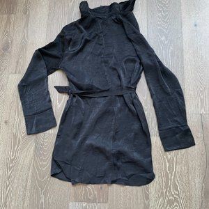 This cute dress from First Distraction The Label features a satin fabrication with rounded hem, slit neck, collar, and sash at the waist.
