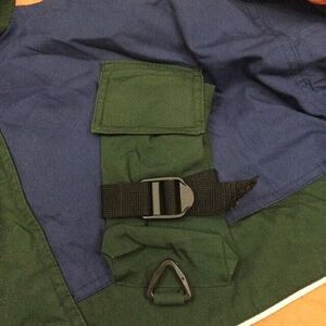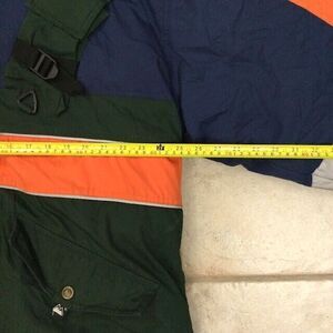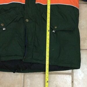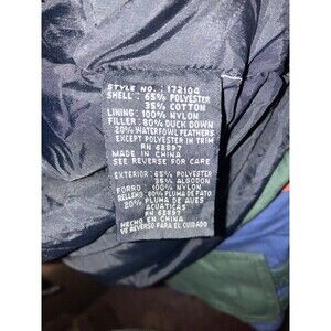 This jacket is in great condition! It might be vintage, based on the overall look, as well as the tag, but I cannot say for sure. It is colorblocked dark green, navy blue, and dark orange. It is a hooded puffer jacket with a shell that is 65% Polyester and 35% Cotton, a 100% Nylon lining, and the filling that is 80% Duck Down and 20% Waterfowl Feathers. Style #172104. Men's size XL. Exact measurements below: