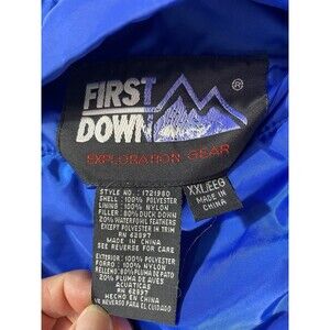The First Down Reversible Duck Down 600 Fill Zip Up Puffer Winter Parka in size XXL is a stylish and practical winter jacket for men. Made with polyester outer shell and nylon lining, this short jacket features a solid blue color with a logo accent. The full zip closure and relaxed fit make it perfect for casual occasions and outdoor activities in winter, such as skiing. Machine washable and with a vintage 90s outdoor theme, this jacket from the First Down brand offers both style and functionality for the colder seasons.