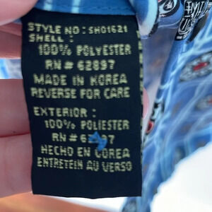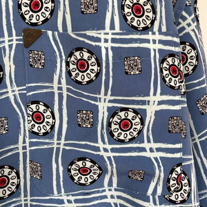 Unique geometric tile pattern, looks like a standing gong and Korean writing, nice pocket detail as seen in photos, nice button details, comes with extra button sewn onto tag