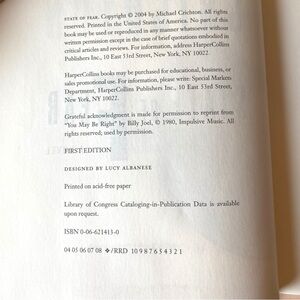 This is a First Edition hardcover of State of Fear by Michael Crichton, published by HarperCollins in 2004. A gripping techno-thriller that blends scientific facts with fast-paced action, perfect for fans of Crichton’s work.