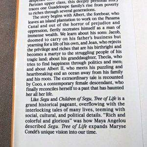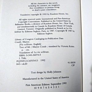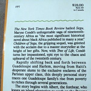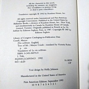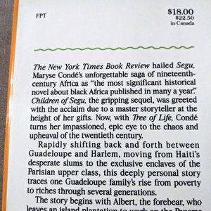 Listed for sale is a 1987 novel by the Guadeloupean writer, Maryse Condé, Tree of Life. 1st American edition (September 1, 1992). The novel tells a multigenerational story about the emergence of the West Indian middle class. The book has stains on the front and back inside covers and the number “6” hand written in pencil on the first page. Please see photos provided.