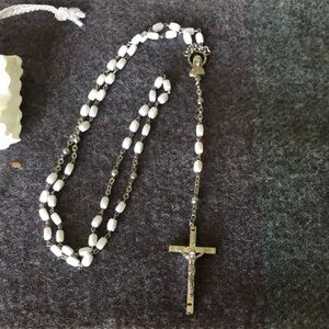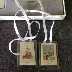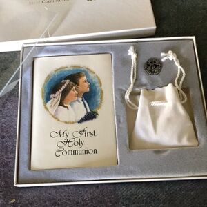 Beautiful First Holy Communion gift set with prayer book, pin, scapular and rosary. Elegant and tasteful white packaging for boy or girl. Rosary made in Italy. Perfect gift. Makes for a nice keepsake.