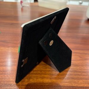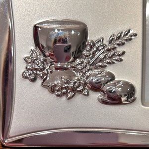 First Holy Communion metal table picture frame. (Silver color, not real silver). Total dimensions are 6" x 6" square. Holds a 3" x 5" picture. Black velvet back. A few minor scratches, but not noticeable- please see last picture and video. Great condition!