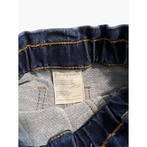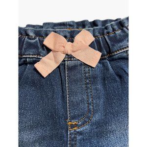 Stylish dark blue denim jeans. Features a cute pink bow. Elastic waistband for comfort. Rolled cuffs for a trendy look.