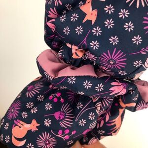 Navy blue base with pink floral and Fox print