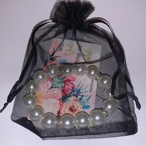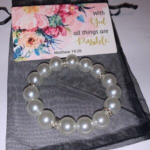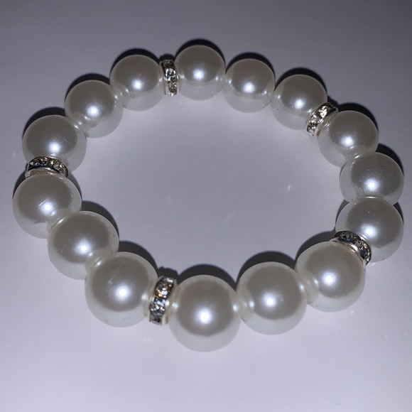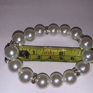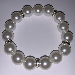 10mm faux white pear beads with silver & rhinestone embellishments double-threaded on elastic cord adds affordable elegance to any outfit.