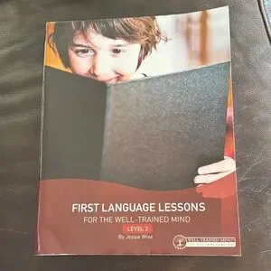 First Language Lessons for the Well-Trained Mind by Jessie Wise. Features a black and red cover. Clean book without writing inside.