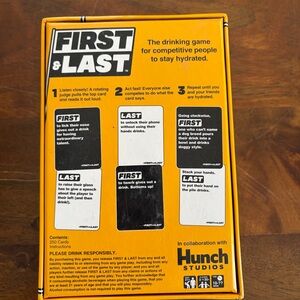 First & Last drinking game for competitive fun. Bright yellow box with bold graphics. *FOR ADULTS - DRINK RESPONSIBLY*