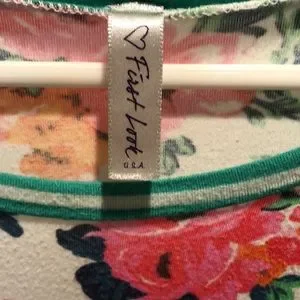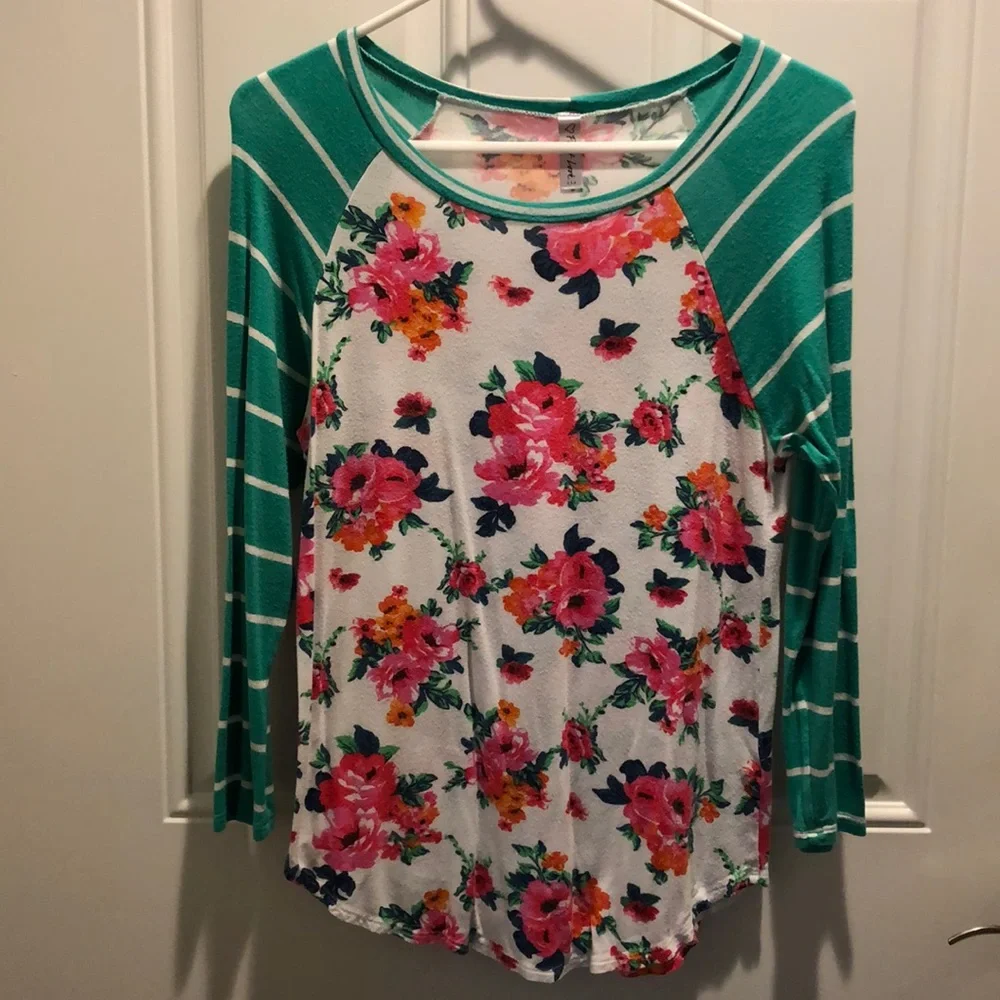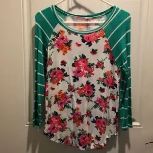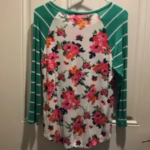 First Look Raglan Tee w/Stripped Sleeves and Floral Chest/Back, Size S