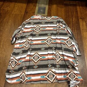 Open-front Aztec print cardigan with crochet edge. Soft knit fabric for easy layering. Colorful geometric accents throughout.