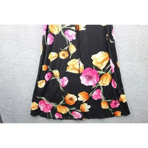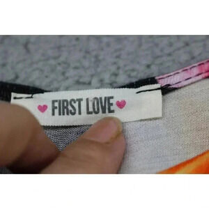 This is a Women's "First Love" Dress that is a size Large. It is 95% Rayon and 5% Spandex. It is thin and soft. It does have some give to it. It measures laying flat: Armpit to armpit-20" and the length from the back of the collar to the bottom hem is 54". It does have a small white dot in the front, nothing a sharpie wouldn't fix. lol Very unique and pretty dress.