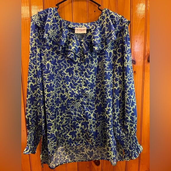 Floral ruffle blouse from the brand First Love. The blouse features a blue and green floral pattern, a ruffled v-neckline, and long sleeves with smocked, ruffled cuffs.