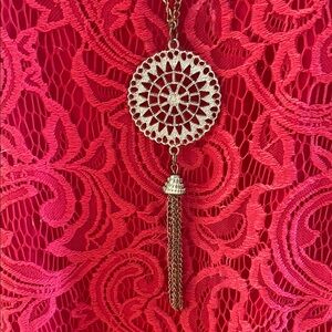Attached gold mandala necklace adds a super cute touch! (Necklace can be unattached to top by lobster claw hook. Please note there is some yellowing to where hook is attached. This doesn't show when worn