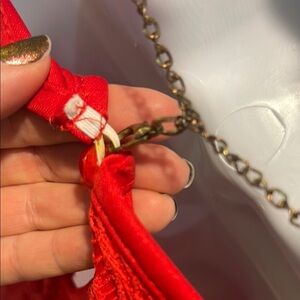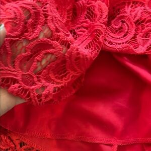 Red lace outer layer over a silky feeling inner liner. 100% polyester.