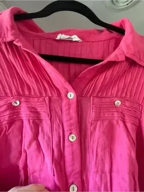 Bright hot pink blouse with subtle ribbed texture. Button-front styling and a classic collar. Bold color for standout outfits.
