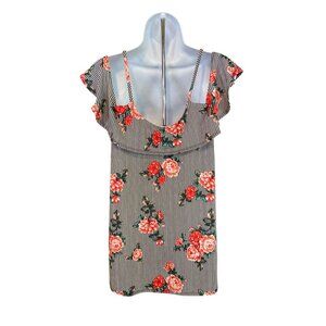 First Love Ruffle Tank Top L Black White Floral Stripe Red Roses Boho Summer Y2K