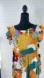 Vibrant tunic blouse with a bold floral and doves of peace pattern. Features shades of mustard, red, green, and white.