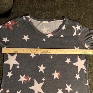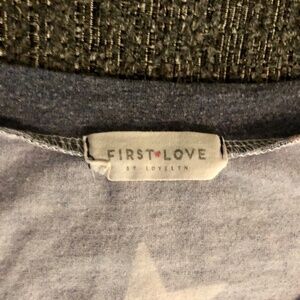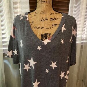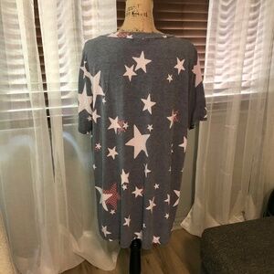 First Love by Lovelyn Womens Shirt Top Blouse Stars Pattern Short Sleeve Size 3X. Cute V-neck shirt with ash gray color with white stars with pinkish red shadows. Tag is kind of faded but i believe it shows material as 70% Polyester, 25% Rayon and 5% Spandex. Shirt is in good used condition. This shirt has been washed. Pet free, smoke free home.
