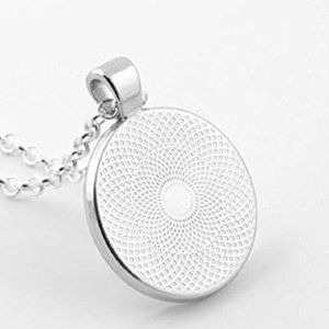 Pendant measures 1 inch (25mm) in diameter. Chain length is 24 inches long (61cm).