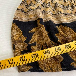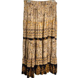 This soft and flowy vintage skirt from First Option is a must-have for any bohemian-inspired wardrobe. The tiered design and ethnic/western print pattern create a unique and stylish look that is perfect for casual wear, parties, or even work. The skirt has an elastic waistband for a comfortable fit and is made from lightweight rayon fabric that is perfect for summer, fall, and spring seasons. The gypsy style beige and brown color combination is perfect for any occasion and the skirt length is long enough to provide full coverage. The skirt is labeled as size L and should be dry cleaned only.