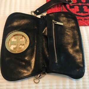 100% Authentic Tory Burch Reva Black Clutch/Shoulder Bag, with gold emblem and hardware, detachable strap, comes with Dust Bag, soft and supple leather, Tory Burch logo on zipper pulls, in excellent condition. Only used a few times.