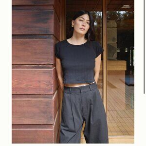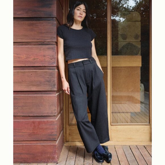 "Our best seller is back in a new structured cotton twill for Fall. The Ana Crop is designed with front pleats and the perfect amount of volume through the hips and leg with a cropped fit. Closes with a zipper and hidden hook and bar closure at the center."
