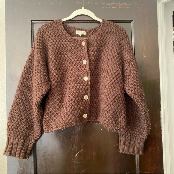 Brown cardigan from First Rite. Boxy fit, handmade from Peru, 100% highland wool, but it’s not itchy, very comfy. Marked a size small has an oversized fit. This has only been dry cleaned, piling throughout but otherwise in great condition. Comes from a pet friendly home, but all garments are cleaned, lint rolled, and de-piled to the best of my ability before being sent out🙂.