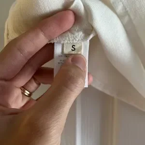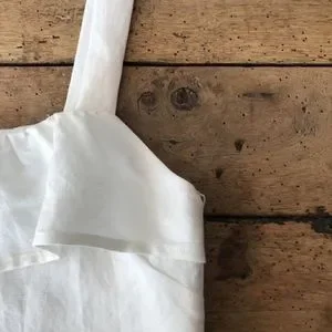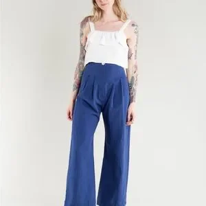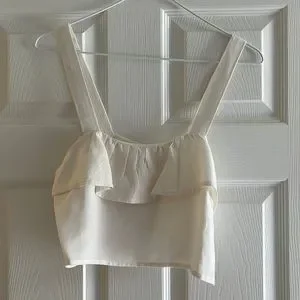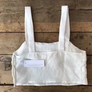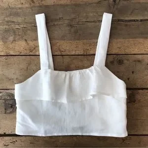 Ruffle tank, a cropped sleeveless top with a slightly boxy fit, that opens with buttons set inside a hidden placket. 65% linen 35% rayon. Available in White.