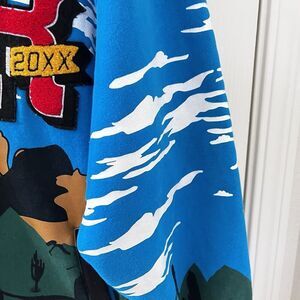 First Row Graphic Mountain Hoodie Full Zip Embroidered Applique Men's Size Large. Very cool hoodie, allover mountain graphic print with embroidered applique details. Has been worn and washed and neck loop has come unsewn inside of the hoodie and some normal wear to the graphic. Please see the pictures. Good Used Condition.
