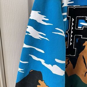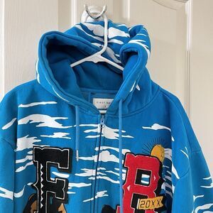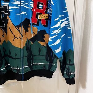 First Row Graphic Mountain Hoodie Full Zip Embroidered Applique Men's Size Large. Very cool hoodie, allover mountain graphic print with embroidered applique details. Has been worn and washed and neck loop has come unsewn inside of the hoodie and some normal wear to the graphic. Please see the pictures. Good Used Condition.