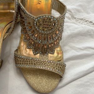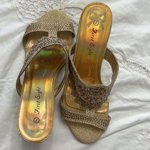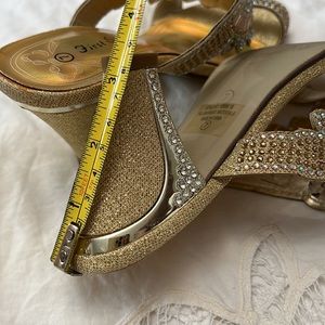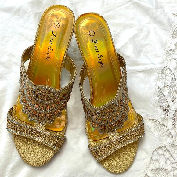 Perfect for formal events. Heels is accentuated with details and low enough to be comfortable. Slight imperfection on the right foot on the strap. (See pictures)
