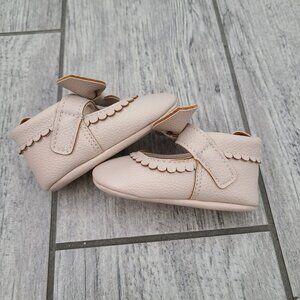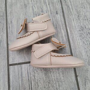 Adorable First Steps baby girl crib shoes with a soft faux leather upper in light pink. These baby shoes feature a sweet bow accent on the strap, scalloped edge detailing, and soft soles for comfort. Designed for infants, they’re perfect for special occasions, photos, or everyday wear.
