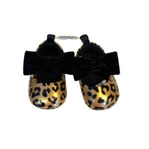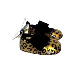 These adorable baby shoes boast a striking golden leopard print design, perfectly paired with plush black velvet bows for an elegant touch. Soft yet durable, these Mary Janes are designed to cradle tiny feet in style, ensuring comfort and a standout appearance. Perfect for baby girls size 1 aged 0-3 months.