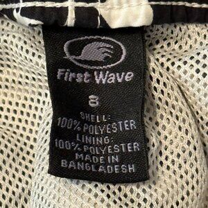 keywords: boys swim trunks, First Wave shorts, floral board shorts, size 8 swimwear, black and white trunks, polyester swim shorts, boys beachwear, quick-dry swimwear, elastic waistband shorts, side pocket shorts, velcro closure swim trunks, mesh lining trunks, Bangladesh-made swimwear