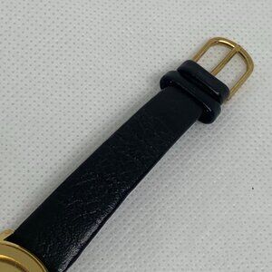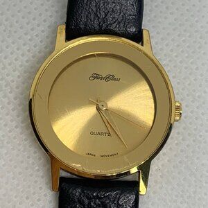 First class women vintage watch gold tone 25mm round case quartz analog black leather band fits up to 6.5”, used condition face scratched battery installed