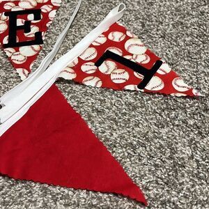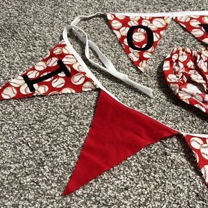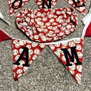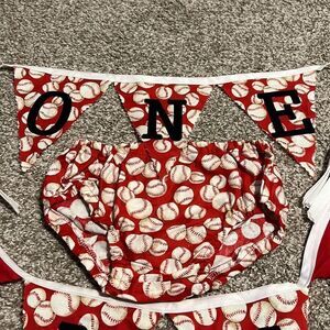 First Birthday Banners & Diaper Cover Red Baseball Sports Handmade 3 Piece Set