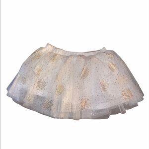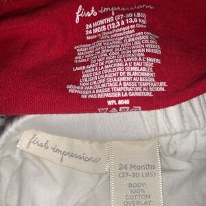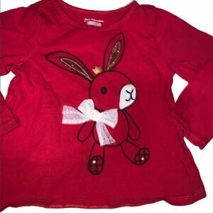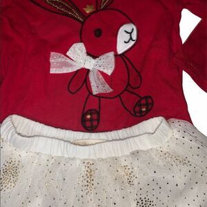 Baby girl red long sleeve top. Bunny with gold crown and ivory and gold bow design on front. Crewneck. 100% cotton. Ivory tutu with ivory and gold overlay. Elastic waistband. Body: 100% cotton. Overlay: 100% polyester. Size: 24 months. Preowned in good condition.