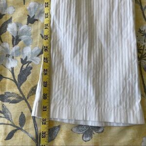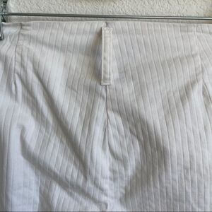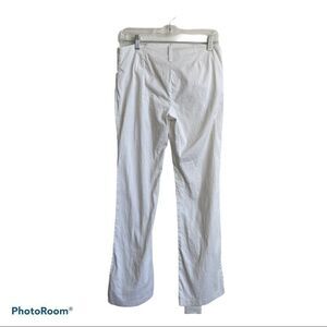 Features: Woven striped white pants. Bootcut. Waist is button, hook eye and zipper closing. Two pocket styling in front and envelope style pockets in back.