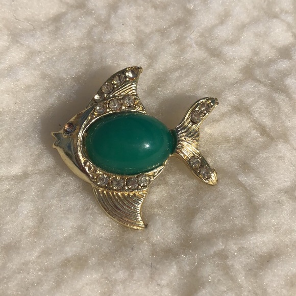 Super cute little golden fish brooch adorned with rhinestones and a beautiful green stone in the center.
