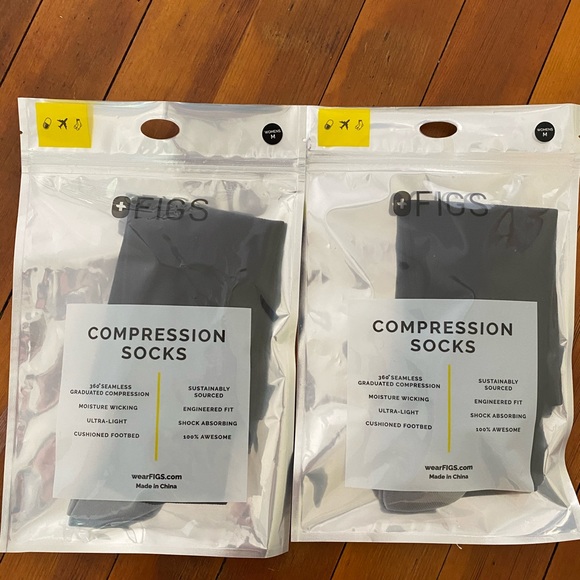 Two packs of new never opened Figs size medium black with gray toe and heel accents compression socks. One foot says “just go for it” on the bottom and the other says “I think you should.”