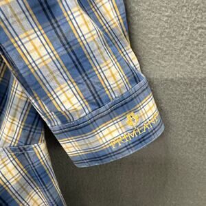 Fish Hippie Shirt Mens 2XL Blue Yellow Plaid Coastal Button Up PRIMLAND LOGO