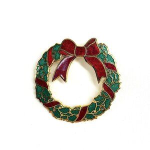 Beautiful vintage 1990's holiday wreath pin by UK vintage jeweler, Fish Industries. This cloisonne enamel Christmas wreath brooch is intricately designed in red and green enamel and gold tone metal. The wreath has a cheerful red bow at the top and a pin with locking clasp on the back. Stamped with the makers mark. Excellent preowned condition. Approx 1.75"