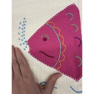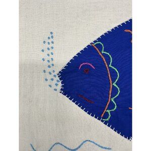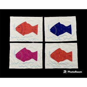 Fish Placemats Applique Embroidered Tropical Rainbow Set Of 4 Primitive Rustic. This is a set of four fun placemats. They have appliqué fish with embroidered details. There are two orange, one pink, and one blue. There are no rips or tears, but there are a few light colored stains and the blue one has a small black stain at the bottom. Please see the pictures for the full description.