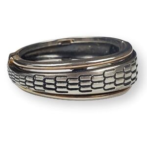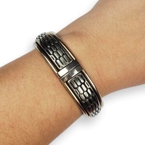 Dark silver tone tapered clamper bracelet with an etched fish scale design and a spring hinge back