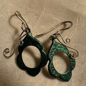 Fish hook earrings Green scalloped teardrop with silver swirl accent